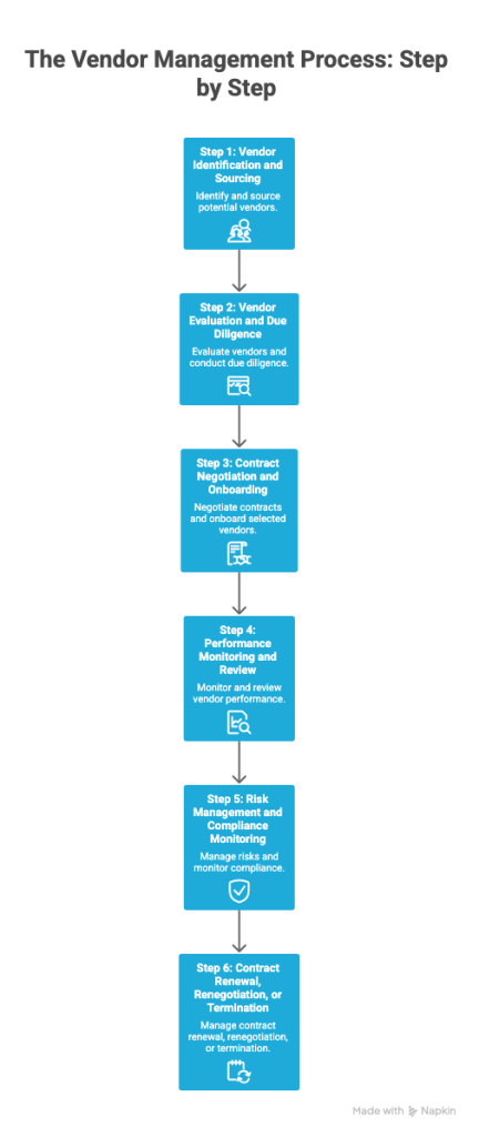 The vendor management process is a structured lifecycle that governs how an organisation engages with vendors from start to finish. Below are the key stages: